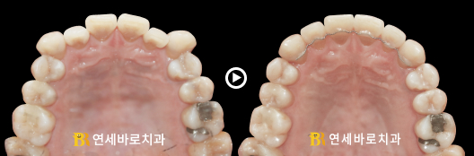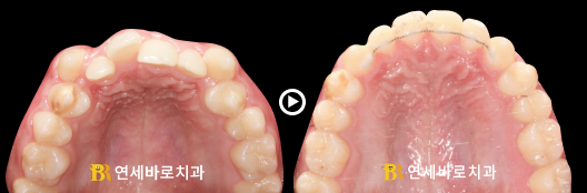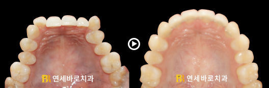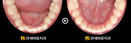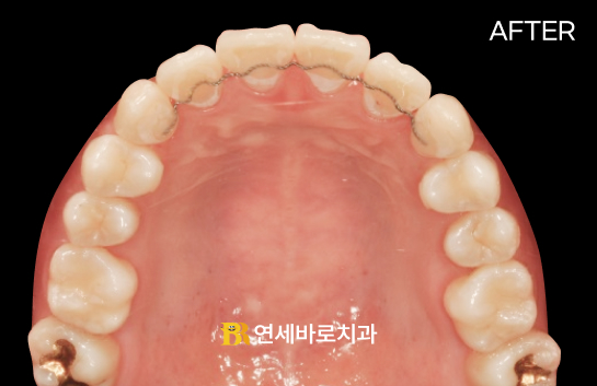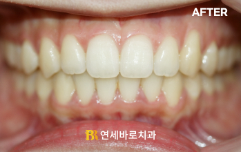 [앞니가 깊게 물린 과개교합 케이스] 아랫니가 완전히 가려진 상태에서 비발치 교정으로 가지런한 배열과 교합을 완성시켰습니다