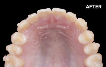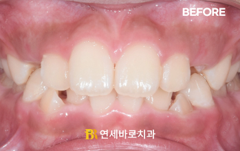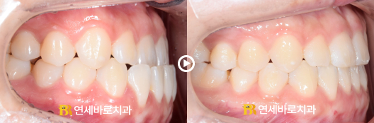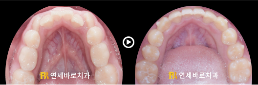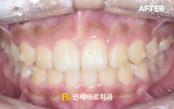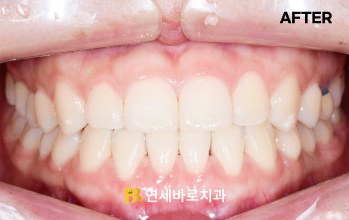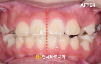 [앞니가 길게 물리고 불규칙한 치열 케이스] 영구치 맹출을 고려하여 고른 배열과 교합을 완성하였습니다
