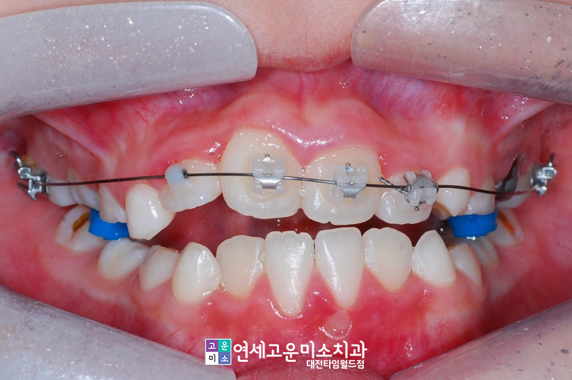치아는 하나도 빼지 않고 교정이 완료되었으며