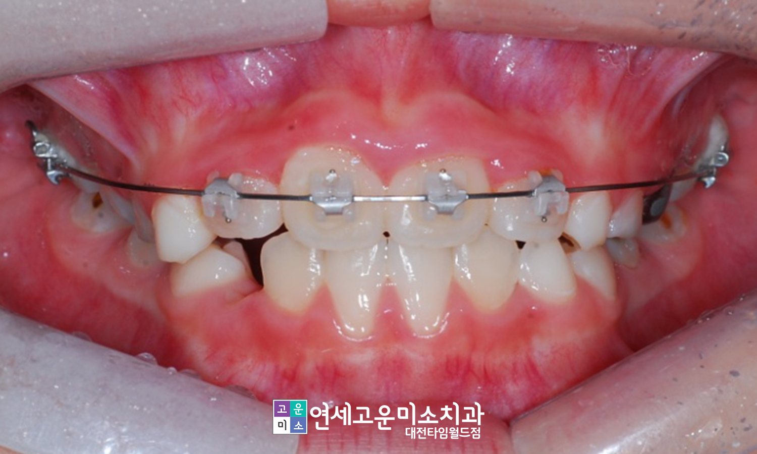 위에 환자분처럼 붙이는 교정장치를 이용하여