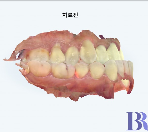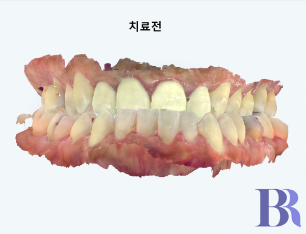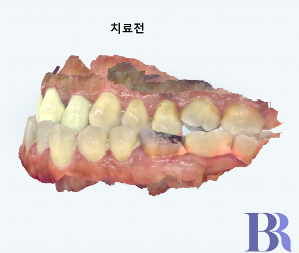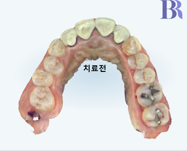 치료 전 윗니 모습 : 앞니가 브릿지로 연결되어 있다.