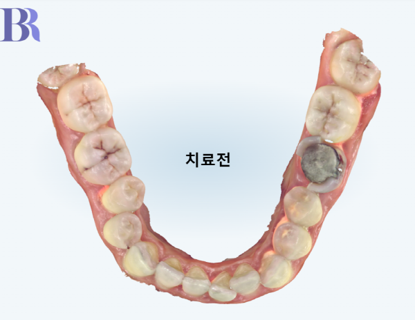 치료 전 아랫니 모습 : 왼쪽 아래 제1대구치 아말감 한 치아가 파절되어 사용할 수 없는 상태,