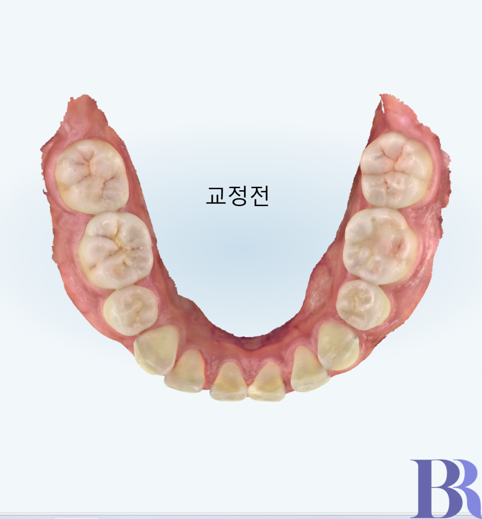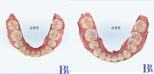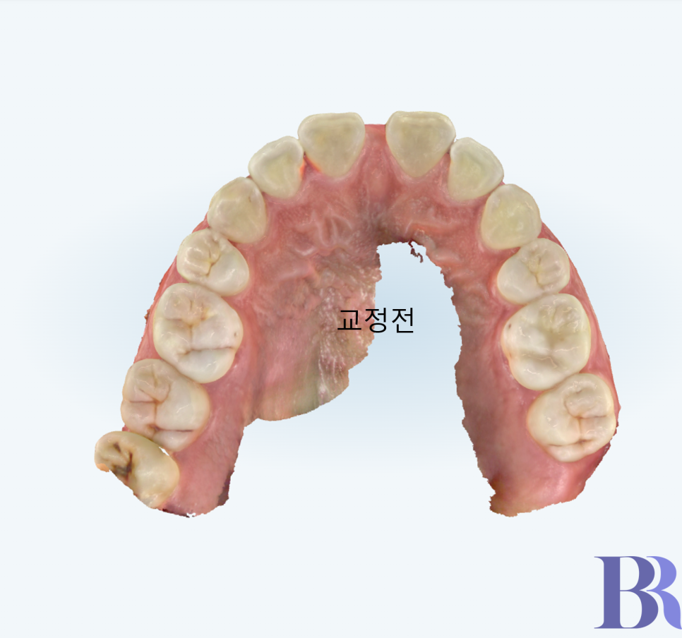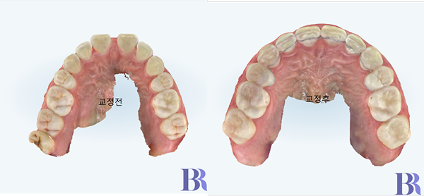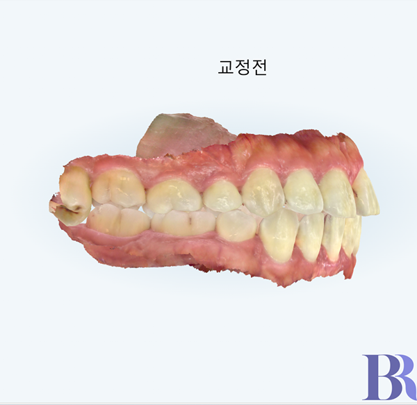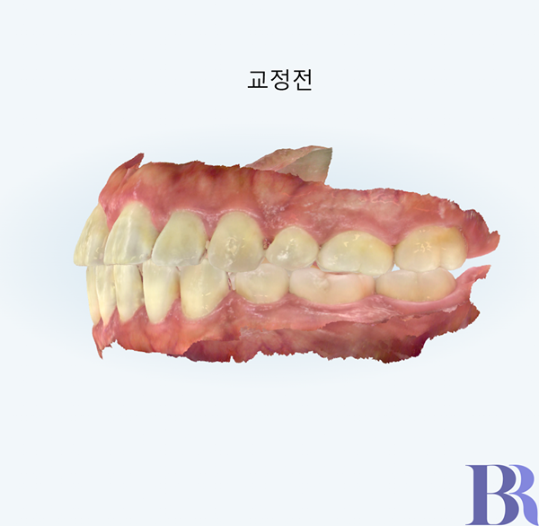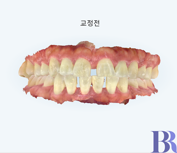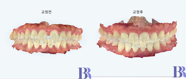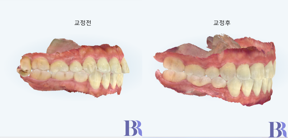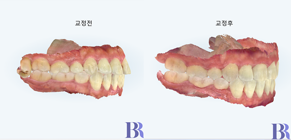 교정 전에 윗니가 뻗어 보이는 느낌이 교정 후에 많이 개선되었다.
