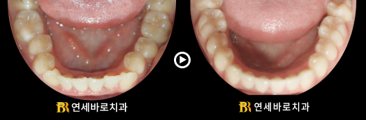 [앞니가 깊게 물린 과개교합 케이스] 아랫니가 완전히 가려진 상태에서 비발치 교정으로 가지런한 배열과 교합을 완성시켰습니다